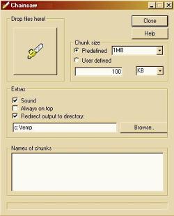 Chainsaw ile tanisin! Bu program ile dosyalari istediginiz boyutlardaki kucuk parcalara bolebileceksiniz. Tek yapmaniz gereken bolmek istediginiz programi testere resminin uzerine getirmek ve istediginiz bolum buyuklugunu secmek! Programin guzel ozellikleri: Cok kolay kullanilan bir yapida olmasi Kurulum gerektirmez, program sadece iki dosyadan olusur. 2 GB’tan daha buyuk dosyalara izin verir. Tum medyalara uyabilecek onceden belirlenmis boyutlar Tum ayarlariniz kullanimlar arasi kaydedilir. Istediginiz yere dosyalari cikarabilirsiniz. Islem sirasinda cok eglenceli bir elektrikli testere sesi cikiyor.Bu guzel ve ise yarayan programin en iyi ozelliklerinden birisi de ucretsiz olarak dagitilmasi.Not: Bolumleme islemi bittiginde program kucuk bir dosya daha ekliyor. Boldugunuz dosyalarin yaninda gorunen bu kucuk dosyayi, ayirdiginiz dosya bolumlerini birlestirmek icin kullanabilirsiniz.