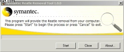 W32.Reatle@mm Removal Tool, W32.Reatle@mm virusunu silmek icin tasarlanmis bir yazilim. Bu yazilim sadece bu virusu tarayabiliyor.Programin Ozellikleri:Toplam aranan dosyayi gosterebilmeSilinen dosyalari gosterebilmeTamir edilen ve cikarilan dosyalari gosterebilmeTamir edilen registry dosyalarini gosterebilme W32.Reatle@mm virusunu sisteme zarar vermeden cikarabilmeW32.Reatle@mm virusune ait dosyalari direk olarak silebilmeW32.Reatle@mm virusune ait registry girdilerini silebilmeDurdurulan servis dosyalarini silebilmeKullanici girislerini engelleyebilme gibi ozellikleri mevcut.Programin Kullanimi:Sistem geri yuklemeyi devre disi birakin,Calisan programlarinizi kapatin,Internet baglantinizi kesin,Bu islemlerin ardindan programi calistirin,Arama bitip size bir rapor verdikten sonra sistem geri yuklemeyi devreye alin,Bilgisayarinizi yeniden baslatin.Bu islemlerin tumu tamamlandiktan sonra bilgisayariniz ve sisteminiz bu virusten tamamen arinmis olacaktir.NoT: Eger Windows XP/2000/NT kullaniyorsaniz sistem geri yuklemeyi devre disi biraktiktan sonra bu programi calistirin.