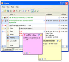 dtNotes programi ile bilgisayarinizin monitorune yapistirdiginiz post-it tarzi notlari yapistirabilirsiniz. Bu notlar, butun pencerelerin tepesinde veya masaustunde gosterilebilirler. Dtnotes, notlar arsivi, otomatik yedek ve not import/export seceneklerini icerir. Ayni zamanda kendi kaliplarinizi da yaratabilirsiniz.Isterseniz yapistiracaginiz notlarin rengini ve desenini de belirleyebiliyorsunuz.
