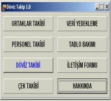 Bu programi kullanarak doviz takiplerinizi yapabilirsiniz.Gunluk rapor, tarih araliginda rapor ve aciklama bazinda rapor alabilirsiniz.Gunluk ve genel gelir, gider durumunu doviz takip alt panelinde her an takip edebilirsiniz.Internetten otomatik kur guncelleme ozelligine sahiptir.Iceriginde ekstra olarak personel, ortaklar ve cek takip modulleri bulunmaktadir.Program tamamen kisitsiz ve ucretsizdir.Programda veri tabani bakimi ve veri tabani yedekleme ozelligi vardir.Programin Ekle/Kaldir bolumunden kaldirabilirsiniz.Programi istediginiz disk bolumu veya konuma kurabilirsiniz. Yer secmez.Detaylar icin programi kurun ve gerisini siz kesfedin.Not:Bu program bir veritabani uygulamasidir. Bu yuzden sisteminizde BDE Veritabani programinin kurulu olmasi gerekmektedir.