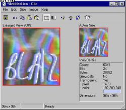 Blaiz Clic, resimlerinizi simge olarak duzenleyebileceginiz bir simge yazilimi. Bu yazilimda herhangi bir resmi ya da simgeyi duzenleyebileceginiz her turlu ozellik mevcut.Blaiz Clic yaziliminin ozellikleri:Standart simge boyutlari gosterimleri. (16x16, 24x24, 32x32, 48x48, 64x64, 72x72, 96x96)Otomatik format belirleme. (1, 4, 8 ve 24bit)Duzenlediginiz ve duzenleyeceginiz simgeleri gosterebilen 2 gorunum ozelligi.Simge detaylari. (renk, boyut, gorunum vb.)Kullanici istegine gore parlaklik ayari.Ekran yakalama ve duzenleme ozelligi.Hizli ve kolay yardim menusu.Yukleme gerektirmez.Kendi simgelerinizi kendiniz duzenlemek istiyorsaniz sizin icin bicilmis kaftan. Ucretsiz ve kucuk boyutlu.