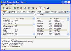 Unit Conversion Tool 5.1 Unit Conversion Tool 78 katagoride 2200den fazla birim arasinda ceviri yapmanizi saglayan bir yardimci programdir.Bu katagorilerden bazilari: uzunluk, alan, hiz, agirlik, hacim, zaman, yogunluk, kuvvet, basinc, enerji, guc, akis, sicaklik, aci, isik, data transfer. Bu surumde birimler arasi cevirilerde bir cok kombinasyon eklenmis. Ornegin uzunluk olcusu mil, yarda ve feetden kilometre, metre ve santimetreye ceviri gibi. Akilli ipucu eklenmis ki program icinde size ipuclari sunuyor. Sag fare tiklamasi ile acabileceginiz birde kayit penceresi var. Yaptiginiz tum islemlerin kaydini tutuyor. Programin kullanimi kisitli. Her kategoride usten bes birimin cevirisini yapabiliyorsunuz.