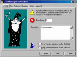 Bu kucuk yazilimin yaptigi tek is kod numarasina gore hata veren Windowsun hatalarini sizin okumanizi saglamak.Istediginiz hata numarasini yaziyorsunuz, program size Windowsun boyle bir hata ile karsilastiginda size gosterecegi uyariyi goruntuluyor.